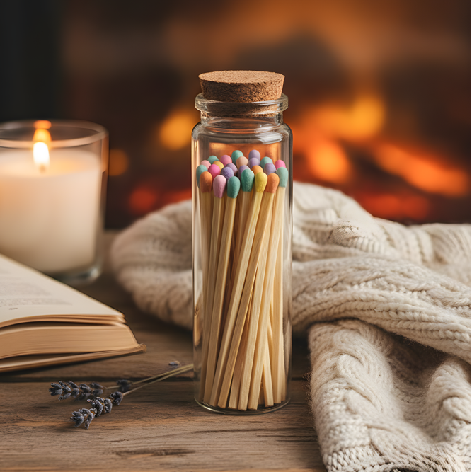 Light up your space in the sweetest way! Our 24 count, 4” long matches come beautifully packaged in a clear glass jar and topped with cork lid. The colorful match tips add an instant pop of joy to your décor. Perfect for candles, self-care rituals, or gifting alongside your favorite Lit Makes scents.